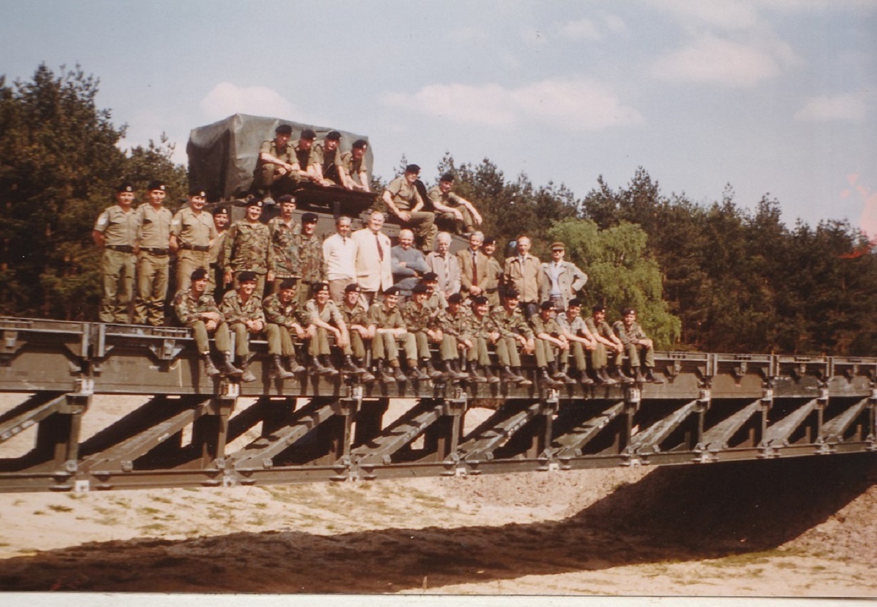 7 Field Squadron RE, Cassino Weekend 11-15 May 1984, the 40th anniversary of the Rapido Bridge Build. 1 Troop with ''The Seven'' Amazon Bridge Veterans on the MGB